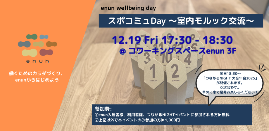 『enun wellbeing day』では身体と心が喜ぶ様々なイベントを企画しています。今回は、『enun wellbeing day』としてスポコミュDay〜室内モルック交流〜を開催します。