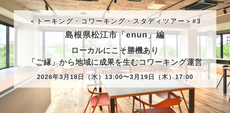 <トーキング・コワーキング・スタディツアー> # … 続きを読む 【開催案内】「enun」コワーキング・スタディツアー~ローカルにこそ勝機あり〜「ご縁」から地域に成果を生むコワーキング運営を学ぶ