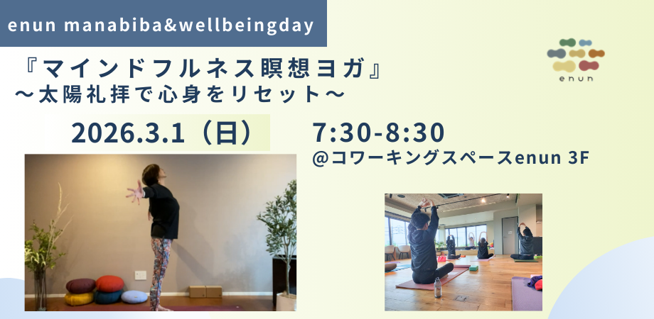 enunでは、『enun manabiba & wellbeing day』として、自分を整える マインドフルネス瞑想ヨガを定期開催しています。
